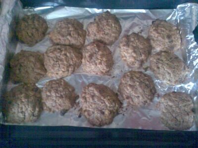 Laptop odarak az asztalra (rossz a nyomtató, kézzel írni meg lustának bizonyultam), recept olvas: keverd össze a lisztet, a cukrot és a diót.. Diót? Milyen diót? Az kimaradt a bevásárlólistából. Nézzük: az apróra vágott diót lehet helyettesíteni mondjuk.. mandulával, ok. A darált diót pedig.. nyuszis kakaóporral, semmi gond.. 🙂 Kell bele még tojás, sütőpor, étcsoki (darabolva) és kockamargarin. Ezt az egészet összegyúr, kanállal halmocskákat képez az aluf.. (akarom mondani a sütőpapírra), tíz perc a sütőben és kész is..